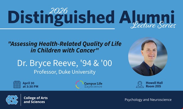 The Department of Psychology and Neuroscience at the University of North Carolina at Chapel Hill is pleased to announce that Dr. Bryce Reeve, Professor at Duke University, will deliver the 2026 Distinguished Alumni Lecture. The event will take place on April 30, 2026, at 3:30 PM in Howell Hall, Room 205. Dr. Reeve, a distinguished alumnus of UNC, earned his Ph.D. in Psychology from the university. Trained in psychometric methods, Dr. Reeve’s work focuses on assessing the impact of disease and treatments on the lives of patients and their caregivers. This includes the development of clinical outcome assessments using both qualitative and quantitative methods, and the integration of patient-centered data in research and healthcare delivery settings to inform decision-making. The lecture will provide an opportunity for students, faculty, and the broader community to engage with Dr. Reeve’s insights and advancements since leaving UNC.