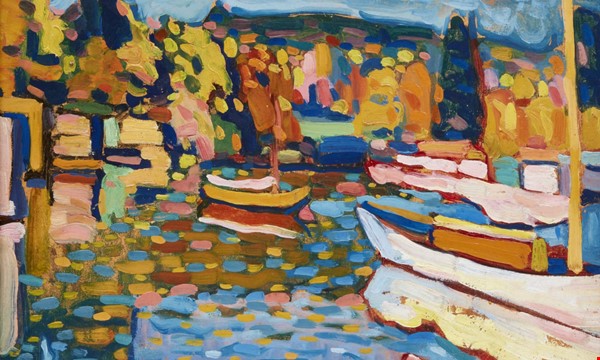 Image credit: Vassily Kandinsky, Russian, 1866-1944, Study for Autumn Landscape with Boats (detail), 1908, oil on board, 12 ×15 3/8 inches (30.5 ×40 cm). Lent by the Robertson Foundation, in honor of Julian and Josie Robertson.